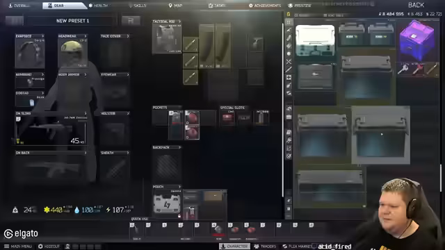 05:02:48Das Hauptziel ist das Absolvieren von Quests. Es wird gezielt nach Gegenständen wie einem Blutsample gesucht, wobei das Suchgebiet auf mehreren Maps variieren kann und der Streamer immer wieder den genauen Ort der Gegenstände klärt. Nebenbei wird intensiv lootet, um Platz im Inventar zu schaffen und wertvolle Gegenstände wie Hosen oder Relais auf dem Flohmarkt zu verkaufen. Das Streaming-Format nutzt eine Sub-Zählung: Für jeden zehnten Subscriber wird am Wheel gedreht, was die Runden dynamischer gestaltet.