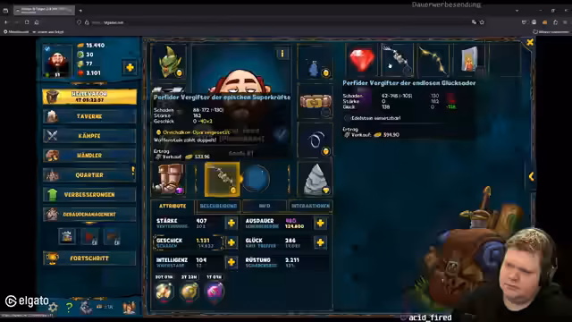 07:08:35Nach der Delta Force Session wechselt der Streamer zu Shakes & Fidget. Er beschreibt die Aktivitäten in dem Spiel, einschließlich des Levels und der Dungeon-Fortschritte. Er erwähnt den Elevator-Modus und die damit verbundene strategische Planung. Es geht um die Optimierung von Ausrüstung durch Edelsteine und die Herausforderung, die richtigen Steine zu bekommen, um den Charakter zu verbessern.