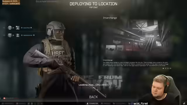 06:43:54Zu Beginn desChunks wird die Map Interchange bespielt. Der Streamer versucht, Loot zu finden und entscheidet sich für einen Riskantesten Transfer, um den Weg nach Hause zu nehmen. Nach anfänglichem Zögern und der Erwägung, die Runde abzubrechen, wird der Transfer zum Spiel gemacht, da das Spiel über kurz oder lang sowieso enden würde. Es gibt Diskussionen über den Verlust von Loot und der Streamer stellt fest, dass er generell zu viel Stress im Spiel hat und sich lockerer verhalten sollte.