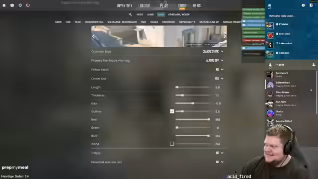 03:12:21Der Streamer beschäftigt sich intensiv mit den technischen Einstellungen des Spiels, um seine Performance zu verbessern. Er empfindet das Bild als zu weich und überstrahlt und drehte die Grafik nach unten. Eine zentrale Problematik ist sein Fadenkreuz, das ihm nicht gefällt und das er als unpräzise empfindet. Er erwägt die Einführung eines Dynamic Crosshairs, um sein Zielen zu optimieren, da er das Gefühl hat, über lange Spielzeiten das Timing verloren zu haben und immer wieder Fails zu erleiden.