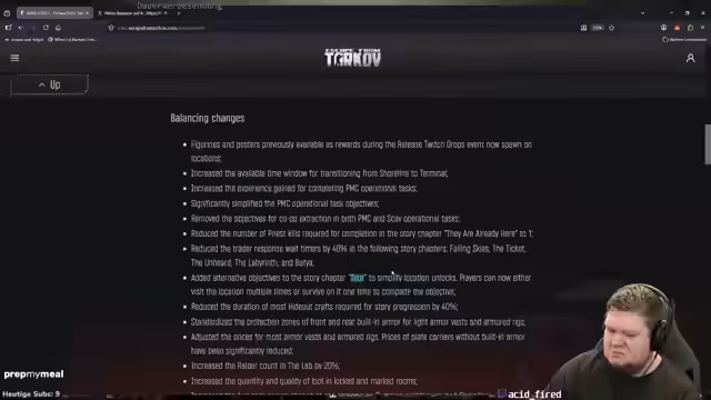 01:46:10Kritik an jüngsten Balance-Änderungen des Spiels, insbesondere an der Reduzierung der benötigten Kills für Story-Aufgaben. Der Streamer ist verärgert, dass nach Abschluss der Story Time-Gates um 40% reduziert wurden, was er als zu spät empfindet. Weitere Änderungen umfassen die Entfernung von Zwangs-Co-op-Extrakt-Aufgaben, kürzere Hideout-Crafting-Zeiten und die Standardisierung von Schutzzonen bei Rüstungen. Die spawn-Chance für Schwerpanzerung wurde erhöht und die Strafen dafür reduziert, um die Attraktivität zu steigern.