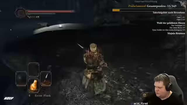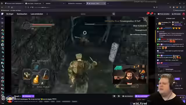 05:58:22Der Streamer beobachtet den Dark Souls-Run von Squee intensiv und analysiert dessen Spielstil. Er gibt Tipps und Feedback in den Chat, obwohl Squee diesen offenbar nicht liest. Der Streamer diskutiert über die von Squee getroffenen Entscheidungen, wie das Upgrade des Zauberstabs und die Verteilung von Seelenpunkten. Er ist besonders gespannt auf das Zusammenspiel von Squees Magier mit dem Bossgegner 'Verfolger', da dies für seine eigenen Pläne relevant ist.