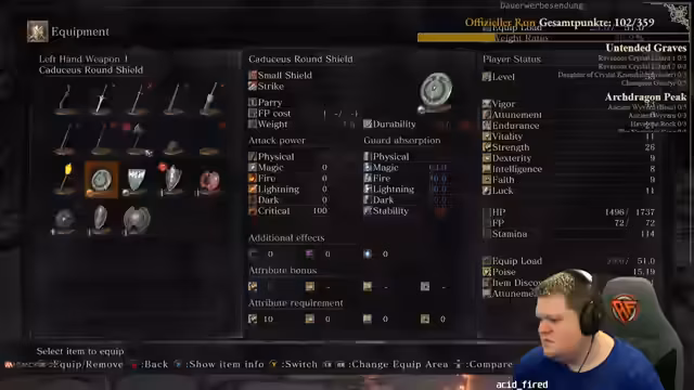 01:50:56Nach einem technischen Neustart setzt der Streamer seinen Dark Souls 3 Run fort. Er gibt an, dass alles ab jetzt komplett blind ist und er keine Ahnung von den bevorstehenden Bossen oder Gebieten hat. Er baut seine Axt auf, trainiert seine Fähigkeiten an Gegnern und navigiert durch neue Bereiche. Die Stimmung ist geprägt von Ungewissheit und dem Versuch, Ressourcen wie Estus-Flaschen klug zu verwalten, während er ständig Gefahr läuft, in Fallen zu geraten oder überfallen zu werden.