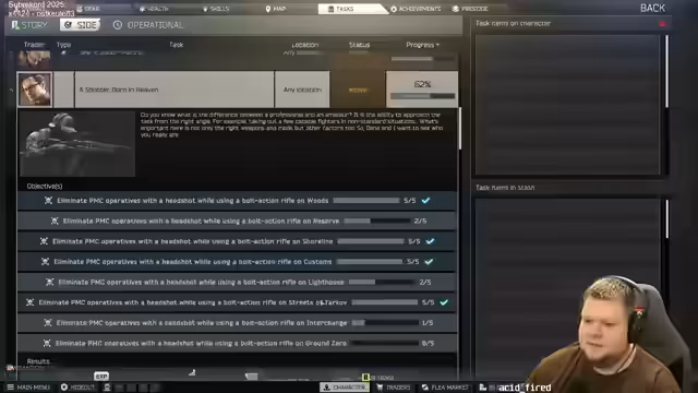 00:05:42Der Streamer wechselt zum Gameplay in Escape from Tarkov und konzentriert sich auf das Sammeln von Waffen zum Wegspielen und das Absolvieren von Quests. Er erwähnt, dass ihm ein E-Drill fehlt, um mit den Quests voranzukommen. Er spielt auf verschiedenen Karten wie Factory und Lighthouse und ist dabei oft in heftige Kämpfe verwickelt, bei denen er sowohl Erfolg als auch Frustration mit Hit-Registration und Server-Problemen erlebt. Die Stimmung ist gemischt aus Action und leichten Rückschlägen.