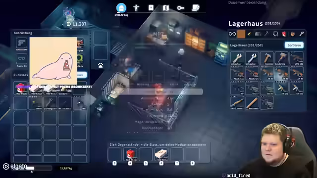 00:41:44Der Streamer stößt auf einen Bossgegner, einen großen Enten-Roboter. Der Kampf gestaltet sich schwierig, da die verwendete Waffe, eine MP7, wenig Schaden anrichtet und schnell kaputtgeht. Nachdem der Streamer den Gegner mit viel Aufwand und knapp verfehlten Schüssen besiegt hat, stirbt er kurz darauf durch einen anderen Gegner. Dabei gehen ihm wichtige Ausrüstungsgegenstände wie ein großer Rucksack verloren. Trotz des frustrierenden Rückschlags bemerkt er, dass die Verbesserung der Munition von Rost- auf Standardmunition einen spürbaren Unterschied im Schaden macht.