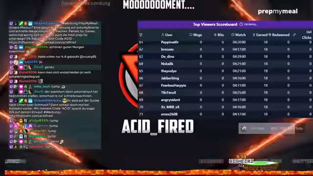 02:14:48Während eines Gefechts versucht der Streamer, eine bestimmte Bewegung auszuführen, was fehlschlägt und ihn in eine exponierte Position bringt. Gleichzeitig werden technische und allgemeine Fragen aus dem Chat aufgenommen, so etwa der bevorzugte Browser oder Kaufüberlegungen wie ein neuer Kühlschrank oder eine neue CPU. Der Fokus liegt dabei auf dem Gameplay, das von zufälligen und weniger skill-basierten Momenten geprägt ist.