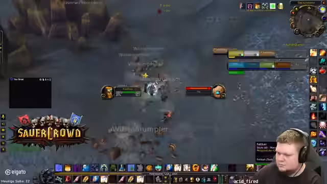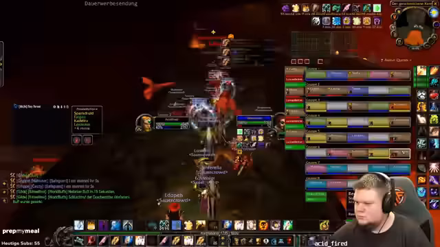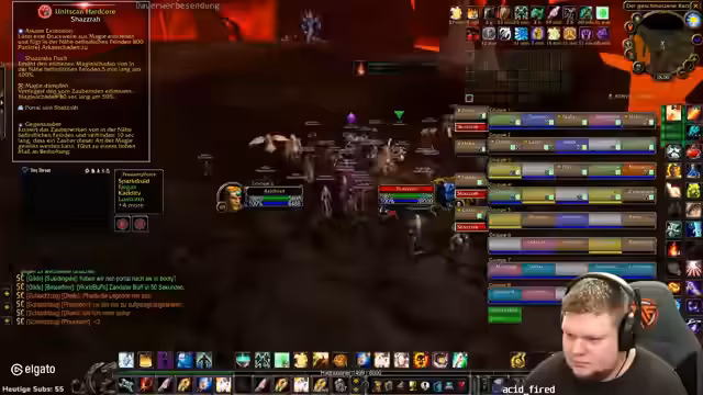12:33:40Der Kampf gegen Magmadar beginnt. Der Streamer ruft die Anweisungen kontinuierlich, um die Spieler bei der Orientierung zu unterstützen. Es geht darum, die festgelegten Ziele nacheinander anzugreifen und die Adds im Auge zu behalten. Der Streamer bemerkt, dass einige Spieler zu früh auf den Boss zielen, und korrigiert dies. Der Ton ist angespannt, da der Kampf überwältigend wirkt und die Einhaltung der Taktik entscheidend ist, um den Wutanfall des Bosses zu verhindern.