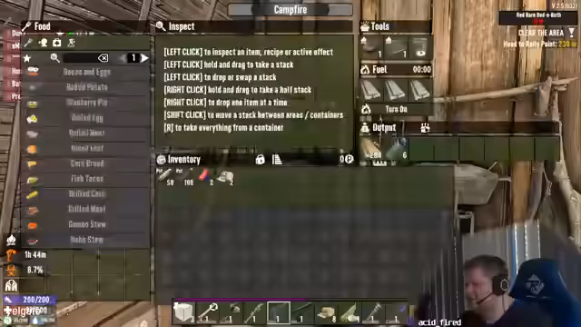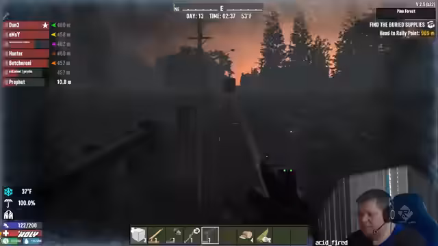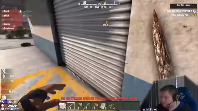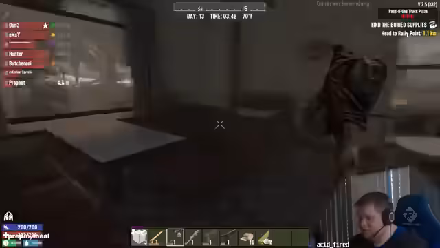 04:00:51Nach erfolgreicher Plünderung des Tanklagers erleidet der Streamer einen starken Gesundheitsverlust und kämpft gegen den Hungertod. Obwohl er Gegenstände wie Fleisch und Kondensmilch zu sich nimmt, führt dies teilweise zu negativen Effekten wie Durchfall. Während er verzweifelt nach Nahrung sucht, verliert er die Orientierung und kann den Weg zurück zur Basis nicht mehr sicher finden, was zu erheblichen Frustrationen und einer nächtlichen Gefahr führt.