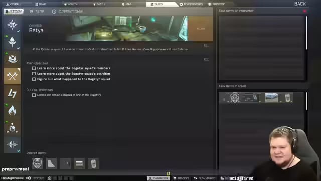 01:59:53Zurück im Spiel ringt der Streamer mit der unklaren Questlogik der 'Bogartier Squad'. Er hat bereits mehrere Lager durchsucht, kann aber bestimmte Ziele wie 'Bogartier Squad Members' nicht finden. Da die Spielmechanik nicht selbst erklärend ist, wendet er sich direkt an den Chat um Hilfe und bittet um Spoiler, die ihm den weiteren Weg weisen sollen.