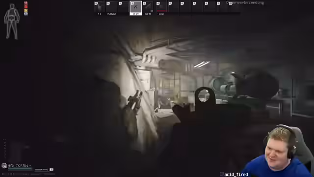 04:37:32Die Erkundung des Labors beginnt mit der Suche nach Gegnern und Ressourcen. Der Streamer orientiert sich unsicher und sucht nach einem bestimmten Raum, während er bereits mehrere Gegenstände wie ein PGW, eine Leiche und eine ESA entdeckt. Die Konversation deutet auf eine Spielweise hin, die auf schnelles Finden und Sammeln von Ausrüstung abzielt, wobei die Zusammenarbeit mit einem Mitspieler namens Samkowski erwähnt wird. Die Suche bleibt trotz intensiver Bemühungen zunächst ohne konkreten Erfolg, was zu einer leichten Frustration führt.