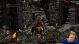 01:43:18Mit den ersten 5 Punkten im Gepäck, konzentriert sich der Streamer auf das Sammeln von Seelen und Gegenständen, um seine Figür zu stärken. Er entscheidet sich, weiterhin mit seiner Axt zu kämpfen, da er mit dieser Waffe die meiste Erfahrung hat und die Reichweite besser einschätzen kann. Er beginnt, den Weg zum zweiten Turm zu finden, wobei er unsicher und nervös ist, da manövrieren und bestimmte Bewegungen für ihn gerade schwierig zu bewältigen sind.
