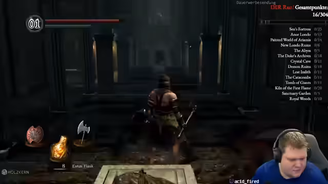 01:34:28Der offizielle Soulkeeper-Run beginnt. Der Streamer ist extrem nervös und macht gleich zu Beginn Fehler, wie das unabsichtliche Trinken eines Tranks, anstatt anzugreifen. Trotzdem gelingt es ihm, den ersten Boss, den Asyldämon, zu besiegen und damit die ersten Punkte zu sichern. Der Streamer atmet auf, da das Schlimmste, nämlich null Punkte zu machen, vermieden ist. Er geht nun mit einem "score von 5" in den weiteren, ungewissen Teil des Spieles, bei dem weitere optional Herausforderungen auf ihn warten.