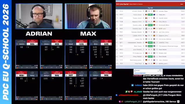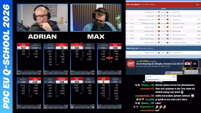 01:13:02Die Entwicklungen auf beiden Seiten des Atlantiks sind weiterhin eng und dramatisch. In der UK Q-School gewinnen Steve Beaton und Charlie Manby ihre Partien. George Killington ist mit einem 9-Darter gestern aufgefallen. Das Spiel zwischen Ron Meulenkamp und Lorenzo T. Henepe verspricht ebenfalls spannend zu werden, da beide eine negative Leg-Bilanz aufweisen. In der EU ist Miro Klose im Fokus, der nicht mit seinem Namensvetter Daniel Klose verwandt ist. Die große Anzahl an hochkarätigen und knappen Duellen macht den Finaltag zu einem unvergesslichen Spektakel.