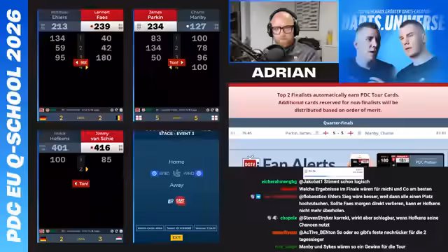 02:38:12Nach einer turbulenten Phase stehen die ersten Viertelfinalisten fest. Kommentiert wird, dass ganze sechs deutsche Spieler wie Jimmy van Ski, Pascal Rupprecht und Daniel Klose in die Runde der letzten Acht einziehen. Kommentator Adrian Geiler erwähnt, dass der Tagessieg – ein Turniersieg – fast zwangsläufig zur Tourkarte führen würde. Es wird deutlich, dass bereits drei deutsche Tourkarten an diesem Tag wahrscheinlich sind, wenn die aktuelle Form sich fortsetzt.