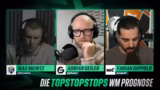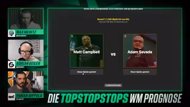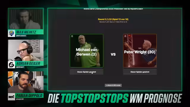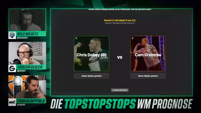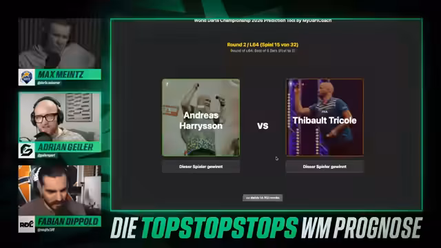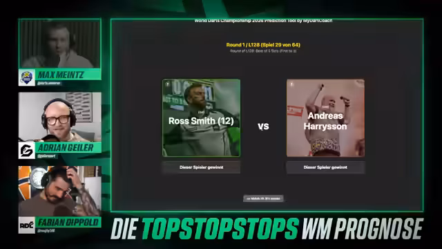 00:02:35Der Stream beginnt mit der Begrüßung der Zuschauer und der Ankündigung der offiziellen WM-Prognose von 'Tops, Tops, Tops'. Die Moderatoren Adrian Geiler, Max Meintz (Darts Universe) und Fabian Dippold alias Roughy180 haben das Ziel, ihre Tipps für die PDC-Dart-WM 2023 vorzustellen und zu diskutieren. Die Prognose wird Runde für Runde durchgegangen, wobei jeder seiner Tipps vorgestellt und dann von den anderen kommentiert wird. Zusätzlich wird ein Podcast am folgenden Tag und ein Check-in-3-Stream am ersten Mittwoch der WM erwähnt, bei dem Roughy180 wieder dabei sein wird.