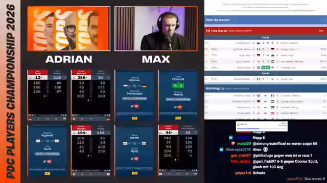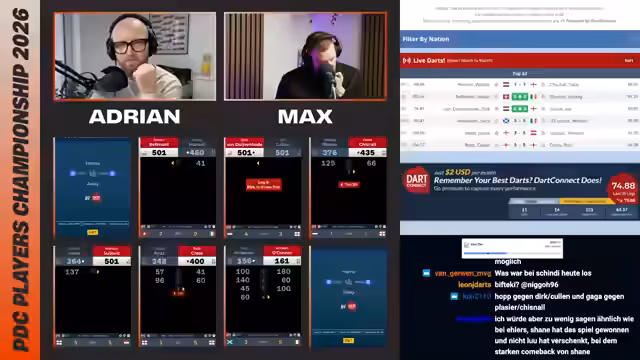 02:16:47Die Aufmerksamkeit richtet sich auf Martin Schindler. Nach seinem schwachen Erstrunden-Spiel mit 63 Average gibt es eine hitzige Diskussion im Chat. Der Streamer rät zur Abwarten, betont aber auch die Sorge um Schindlers letzte Entwicklung und seinen Drang nach Major-Ergebnissen. Einige Spieler wie Luke Woodhouse werden als positives Beispiel genannt. Schindlers nächstes Spiel ist auf PDC TV.