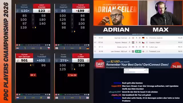 00:49:11Der Streamer berichtet über die laufenden Partien in der zweiten Runde. Es werden die Duelle von Gabriel Clemens gegen Charlie Manby und Lukas Wenig gegen Nico Springer erwähnt. Besonders der Auftritt von Clemens wird als positiv und wie "der alte Gaga" beschrieben. Gleichzeitig werden weiterhin technische Probleme bei der Darstellung der Spiele auf PDC TV und im Stream selbst beklagt. Das Öffnen bestimmter Spiele ist oft nicht möglich oder springt zu falschen Übertragungen, was die Kommentierung erschwert.