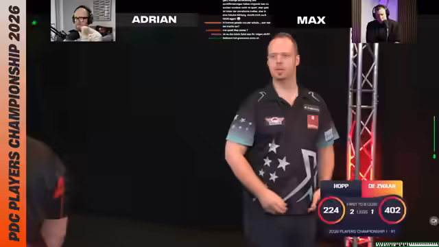 00:02:01Max Hopp bestreitet sein erstes Spiel gegen Jeffrey Desvan. Er präsentiert sich von der ersten Minute an stark und spielt konstant hohe Averages um die 96 Punkte. Nach einem frühen Break führt er schnell mit 2-0. Sein Spiel wird als "grundsolide" und "geil" beschrieben, mit gutem Scoring und starkem Finish. Er nutzt seine Chancen konsequent und gewinnt das Match klar mit 6-2. Das wird als perfekter Start in die Saison und als Bestätigung seiner guten Leistung vom Vorjahr bewertet.