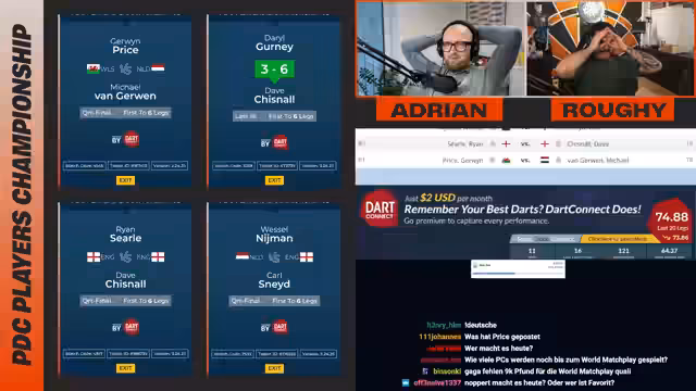 04:24:20Danny Noppert wird im Chat als „Herzenbrecher“ bezeichnet, da er in seinen Matches gegen deutsche Spieler wie Gabriel Clemens stark auftrat und sie besiegte. Im Viertelfinale wurde das Set festgelegt, mit Duellen wie Michael van Gerwen gegen James Wade, Noppert gegen Ratajski und Price gegen Neumann. Auch Searle gegen Chisnell und Van Gerven gegen Hurrell sind interessante Paarungen, die für Spannung sorgen.