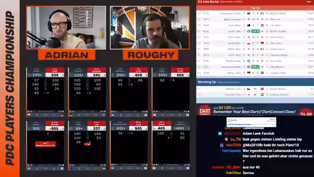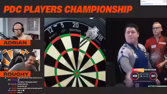 01:21:19Das Turnier neigt sich dem Ende zu und die letzten Deutschen sind im Wettkampf. Max Hopp kämpft gegen Johnny Clayton, während Lukas Wenig sein Spiel gegen Oskar Lukasiak beginnt. Die Kommentare spiegeln die durchwachsenen Leistungen der deutschen Spieler wider. Einerseits haben einige wie Leon Weber und Kai Gotthardt gute gezeigt, andererseits sind auch Starpower wie Gabriel Clemens und Peter Wright frühzeitig ausgeschieden. Die Kommentatoren fassen die bisherigen Ergebnisse zusammen und werfen einen Blick auf das noch laufende Finale zwischen Dave Chisnell und Shane McGurk.