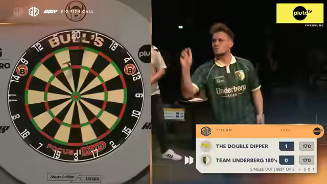 01:50:52Das zweite Halbfinale startet mit den Spielern Bela und dem Community-Team Team Underberg. Das spezifische Regelwerk des Big Fish Call wird erklärt: Das Spiel beginnt bei 170 Punkten, und der Spieler muss vor jedem Wurf das anvisierte Feld ankündigen; nur Treffer in diesem Feld zählen. Kommentator Carlos kommentiert das Spiel und analysiert die Taktik der Spieler. Es wird die Hypothese aufgestellt, dass das Community-Team durch die unerwartete Teilnahme unter Druck stehen könnte.