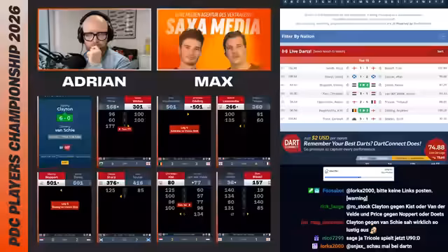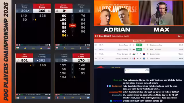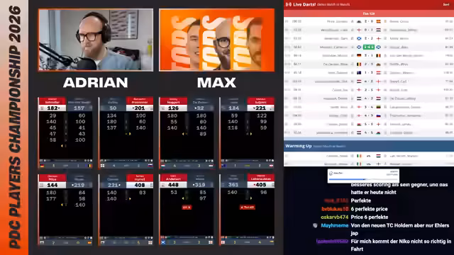 00:00:59Es gibt vier Streaming-Boards, wobei nur eines live auf Deutsch kommentiert wird. Board 1 zeigt Scott Williams gegen Andrew Gileding, Board 2 Leon Weber gegen Conor Scud. Andere Boards beinhalten Spiele wie Ricardo Petrezko gegen Sebastian Biowetski und Rob Cross gegen Steven Burton. Viele Top-Spieler sind im Hauptfeld vertreten, jedoch auch einige Absagen. Fokus liegt auf den Deutschen und ihrer Performance.