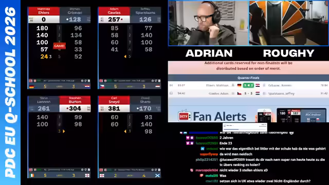 02:33:24Der Stream zeigt verschiedene Matches der Q-School. Marvin Kraft dominiert mit einem Schnitt von 99 Punkten und einem 80er Rest zum 3-1. Luca Wolf, der 16-jährige Nachwuchsspieler, führt ebenfalls mit 4-2 und wirft starke 180er. Parallel dazu wird der aktuelle Stand der Dart-Rankings erwähnt, in dem Luca Wolf führt, während Marvin Kraft wichtige Breaks erzielt. Das Geschehen ist hochspannend und von konstant hoher Qualität geprägt.