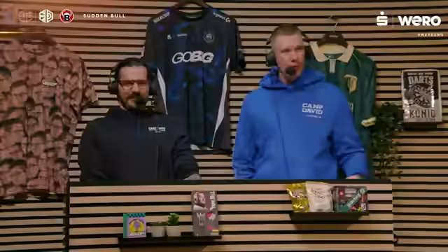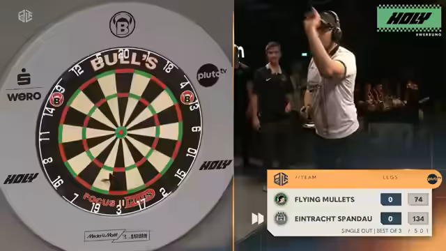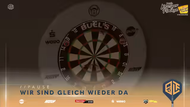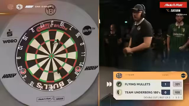 04:40:55Das Finale beginnt mit einem ersten Aufschlag von Sven für die Flying Mullets, der sofort mit einer beeindruckenden 180erfolge startet. Die Unterbergs reagieren mit eigenen starken Punkten, besonders Rodriguez zeigt gute Leistungen. Das Spiel ist ausgeglichen, und die Gamebreaker-Phase wird als entscheidend angesehen, da sie das Spiel beeinflussen kann. Die Spannung steigt, da beide Teams um den Sieg kämpfen.