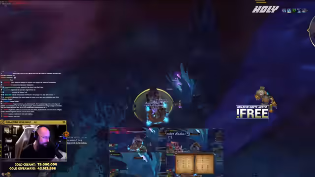 01:25:42Nach einer kurzen Pause unterhält sich der Streamer mit dem Chat und startet ein Giveaway für alle Zuschauer. Für die nächsten 15 Minuten können Teilnehmer durch Eingabe von 'Ausrufzeichen Free' in den Chat Gratis-Punkte sammeln. Der Streamer kündigt an, dass er als Preis erneut Spielzeit im Wert von circa 325.000 bis 330.000 Gold verlosen wird, da er von seinem letzten Stream noch offene Spielzeit-Codes hat.