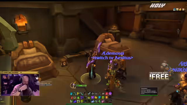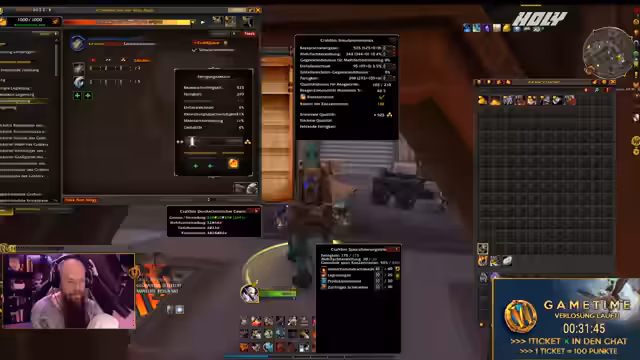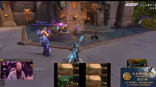 00:30:32Eine Stunde nach Streambeginn startet der vertraglich vereinbarte Game-Time Giveaway. Teilnehmer sammeln Punkte über Ausrufezeichen im Chat und können diese gegen Lose für die Verlosung einer WoW-Marke eintauschen. Der Streamer betont, dass die Teilnahme kostenlos ist und jeder mit mehr Punkten eine höhere Gewinnchance hat. Er erwähnt, dass er technisch gesehen auch Gold verlose, da er es zur Finanzierung der Preise nutzt.