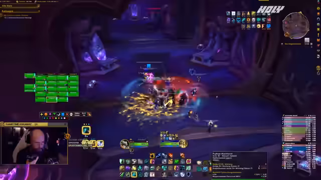 01:35:00Die Gruppe beginnt mit dem Bosskampf. Der Streamer gibt laute und klare Anweisungen für die einzelnen Phasen. Er koordiniert das Ausweichen von Fähigkeiten, das Platzieren von Flächen und die Organisation der Spieler für das 'Soaken' bestimmter Attacken. Nachdem der erste Boss besiegt ist, geht die Gruppe weiter und der Streamer erklärt die Mechaniken des nächsten Bosses, inklusive Teleportern und Schadensfallen.