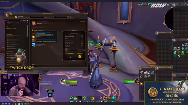 01:28:20Es geht um eine erste Bestandsaufnahme der Berufe. Es werden interessante Rezepte gesucht. Neue Slots zum Verzaubern sind eine nette Info. Als nächstes soll in Lederverarbeitung, Schmiedekunst und Alchemie reingeguckt werden. Kochkunst wird als Nebenberuf angesehen. Es wird ein Kochlehrer gesucht. Es wird sich auf die Main-Berufe konzentriert. Ein Koch wird gesucht. Kochen ist was das Goldmaking angeht mit Nordberuf. Trainer werden noch nicht angezeigt. Der Streamer ist auf der ewig währenden Mission, einen Koch zu finden. Es wird ein Blacksmithing Trainer gefunden. Leatherworking und Skinning sind auch vorhanden. Die Brücke wurde repariert. Es wird sich oft verlaufen werden. Es wird kein Koch gefunden. Jewel Crafting Trainer ist vorhanden. Als nächstes wird Schmied angeguckt. Pistor hat Gold im Wert von der Spielzeit gewonnen. Sobald der gelbe Balken auf ist, gibt es die nächste Spielzeit. Es wird sich der Schmied angeguckt.