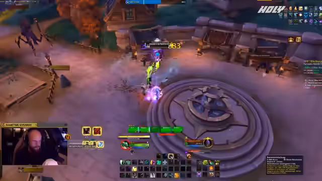 01:03:18Da der Streamer noch Anforderungen für den erfüllen muss, beginnt er einen M+ Key mit einer Truppe. Es kommt zu technischen Problemen mit dem Discord-Chat, das erst nach mehreren Versuchen gelöst werden kann. Während des Laufs wird das unvorhersehbare Verhalten des NPC-Begleiters Brand kritisiert, der in manchen Situationen zu riskant agiert.