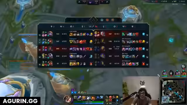 00:01:03Der Stream beginnt als kurze Session, nachdem agurin bereits drei Stunden im Ranked-Modus verbracht hat. Im ersten Spiel spielt er gegen einen Shaco auf Drachen-Niveau, was er als unangenehm empfindet. Er äußert Frustration über sein eigenes Spiel, insbesondere über verpasste Fähigkeiten und geplatzte Kills, und stellt die Frage nach der Normalität der aktuellen Umgebung auf EU West.