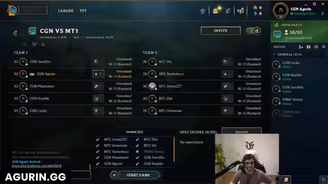 00:52:16Das Team agurins, CGN, bestreitet ein wichtiges Spiel gegen MT1 in der Prime League. Es kommt zu einem langen Draft-Process, bei dem über verschiedene Picks und Bans wie Sion, Ambessa, Talia und Zeri diskutiert wird. Die Session ist von Zeitdruck geprägt und agurin ist sich bei seiner Champion-Auswahl, hier Poppy, unsicher, während das Spiel beginnt.