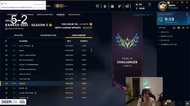 00:09:01Der Streamer drückt seine Frustration über die Spielweise von Jarvan aus und diskutiert über Item-Builds wie Eclipse und Sundered Sky. Er erwähnt, dass er vor einigen Tagen auf Rang 3 war und nun wieder zurück ist, was auf eine Achterbahnfahrt in den Rängen hindeutet. Die Diskussion über seinen Rang und die Leistung seiner Champions zeigt, dass er sich intensiv mit den Feinheiten des Spiels auseinandersetzt und stets versucht, seine Strategien zu optimieren. Trotz der Rückschläge bleibt er motiviert, seine Position in der Rangliste zu verbessern, was er mit dem Satz 'Es ist ein Snow in der Nose' untermauert.