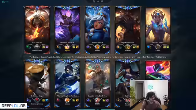 Der Inhalt beginnt mit einer lockeren Unterhaltung über Ernährung und die Vorteile von Gurken, bevor der Fokus auf League of Legends wechselt. Es werden Champion-Picks und Strategien diskutiert, wobei die Bedeutung bestimmter Champions und Teamfights hervorgehoben wird. Die Analyse des Spielverlaufs und die Kritik an Team-Entscheidungen stehen im Mittelpunkt, während der Spieler Frustration über misslungene Züge äußert.