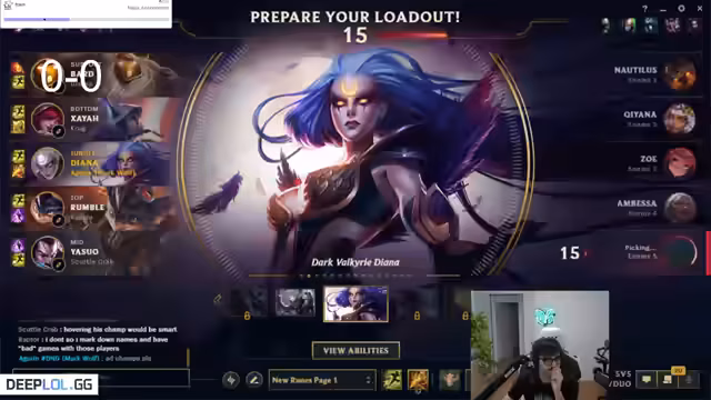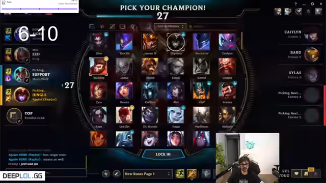 10:19:46Der Streamer beginnt ein neues Spiel mit einem neuen Mitspieler namens 'Gwenn'. Es gibt eine Diskussion über Champion-Picks und Synergien. Er ist skeptisch gegenüber einem blinden Smolder-Pick im Gegenzug zu einem Kha'Zix. Die Stimmung ist jedoch vorsichtig optimistisch und der Fokus liegt auf der Findung einer guten strategischen Basis für das Spiel.