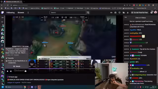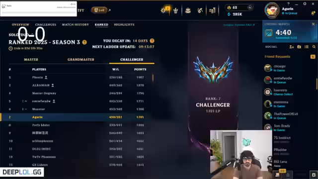 00:01:41Der Stream beginnt mit einem Blick auf die vergangenen Worlds-Games, bei denen die EU alle Spiele verlor. Der Streamer startet den Tag auf Rang 7 und teilt mit, dass er nur etwa zwei Stunden streamen kann, bevor er zu einem Zahnarzttermin muss. Im Gespräch erwähnt er einige Streamer wie Doublelift und Jackspectra und diskutiert verschiedene Spielstile und Empfehlungen.