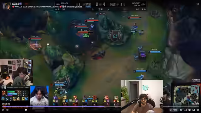 02:30:14Für den Rest des Stream-Zeitfensters wird ein Spiel der Worlds zwischen 100 Thieves und BLG übertragen und live kommentiert. Der Streamer analysiert die Draft-Phase und die Pick & Bans, gibt Einblicke in die Champion-Auswahl und deren Stärken und Schwächen im Meta-Kontext.