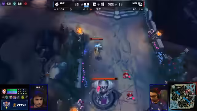 03:24:53Das zweite Spiel gegen KCorp geht verloren. Der Verlust wird auf mehrere Fehler zurückgeführt, die sich im Game aufbauten. Laut Kommentar wurden zu viele unnötige Kills getradet und es fehlte die Snowball-Fähigkeit. Während G2 in der Mitte dominierte, konnte die Korp ein starkes Comeback mit ihrem Toplaner, Broken Blade, starten. Insbesondere das später verlorene Teamfight um den Baron Nashor wird als entscheidender Wendepunkt des Spiels identifiziert.