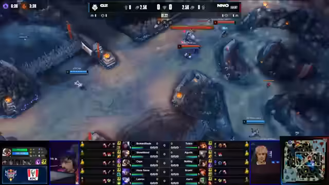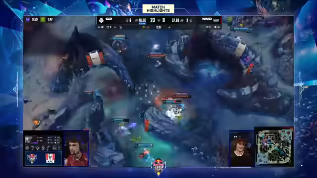 01:10:12Das Spiel wird als sehr actionreich und chaotisch beschrieben. Trotz eines frühen Kills durch NNOs Ezreal Jungle kann G2 schnell den Vorteil übernehmen und den Goldvorsprung kontinuierlich ausbauen. Es wird hervorgehoben, wie der Jungle von G2 den NNO-Support mehrmals tötet und so die Bot-Lane dominiert. Die Kommentatoren bemängeln die Performance von NNOs Top-Laner Tolkien, der im hinteren Teil des Spiels kaum Wirkung zeigt. G2 gewinnt das Spiel letztendlich souverän, was als gute Aufwärmung für das folgende Spiel gegen T1 gewertet wird.