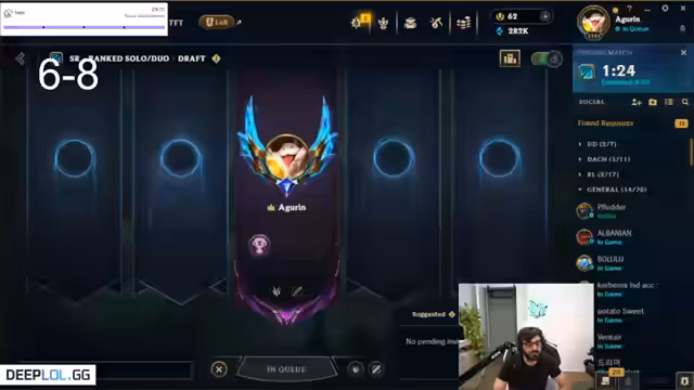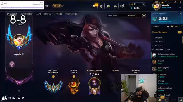 00:01:36Agurin eröffnet den Stream mit der Mitteilung, dass er aktuell Rang 15 auf EU West erreicht hat. Er betont, dass dies kein großer Deal sei, da er häufig hoch gerankt spiele und sein Ziel sei, Rang 1 zu erklimmen. Nebenbei erwähnt er kurz Leak-Drama aus Argentinien und diskutiert Champion-Banns, insbesondere ob Pyke oder Rel gebannt werden sollten, wobei er Jarvan als seine Stärke und Diana als übermächtig einstuft.