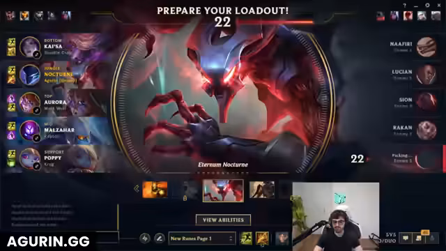 06:36:00Nach dem ersten Spiel beginnt ein neues Match. Der Streamer plant, Nocturne mit Ultimate Hunter zu spielen und sich auf den Jungle zu konzentrieren. Er überlegt, ob er als Nocturne Mid oder Support agieren soll und diskutiert die Stärken des Champions. Es werden erste Item-Builds wie ein Longsword und ein Pink Ward erwähnt, um einen soliden Start ins Spiel zu gewährleisten und die Jungle-Route zu optimieren.