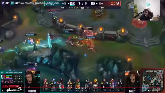 01:12:23Der Streamer wechselt zu einem professionellen Spiel zwischen Vitality und BDS. Er analysiert die Picks und Bans sowie die strategischen Entscheidungen, insbesondere von Vitalitys Jungle. Er kritisiert deren in-effektives Clearing und die riskanten Plays, die zu einem spürbaren Gold-Rückstand führten. Er bewertet die Makro-Entscheidungen der Teams im Detail.