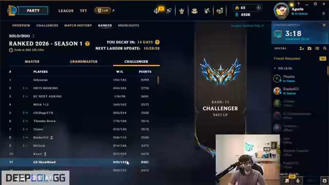 03:13:45Das Matchmaking-System habe sich grundlegend verändert, um Beschwerden über LP-Gewinne zu beenden. Man kann nun entweder schlechte LP-Gewinne oder eine aufgeblähte LP-Skala erhalten. Wer die Spitze erreichen will, wird früher oder später Rang 1 mit 4000 LP erreichen. Die Ladder zeigt durch die LP die aktuelle Leistung genauer an, auch wenn die先生说, dass dies nicht mehr der Fall sei.