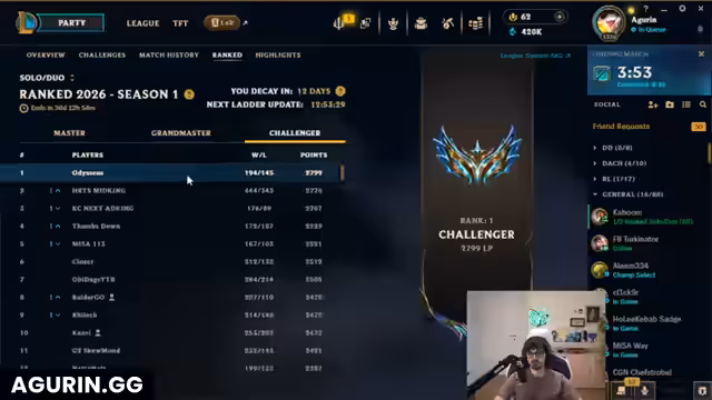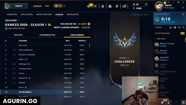 00:01:30Der Streamer startet mit Fragen zur aktuellen Meta und Hotfixes, insbesondere zur Champions Schivana und Nocturne, deren Zuverlässigkeit er anzweifelt. Er stellt fest, dass der Rang 1 Platz nach den neuesten Änderungen weniger vom Skill als von der Menge der gespielten Spiele abhängt und eine Art 'early season rank 1' sei. Nach einer Abwesenheit ist er selbst von Rang 15 auf Rang 47 gefallen und will nun mit einem DuoQ-Partner den Aufstieg versuchen. Das Gefühl des Spiels sei mehr 'Fake' als ein echter Maßstab für Fähigkeit geworden.