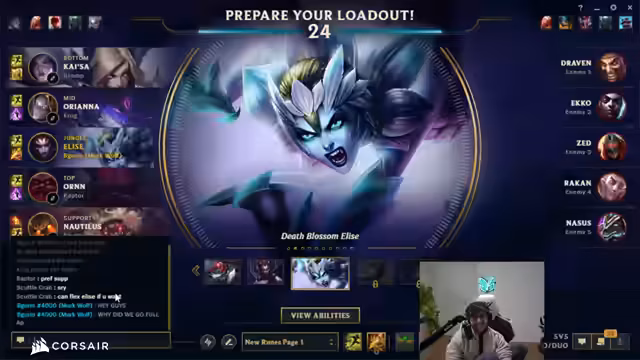 00:00:00Der Stream beginnt mit technischen Problemen bei einem Zapier-Bot. Während des Spiels, das mit der Champion Elise gespielt wird, gibt es viel Verwirrung über die gegnerischen Hooks und eine unklare Team-Komposition. Der Spieler versucht, einen early Double Crab zu vollziehen, ist sich aber unsicher über die Vorteile und die strategische Ausrichtung. Der Fokus liegt auf dem Jungle-Setup und den map-weiten Bewegungen.