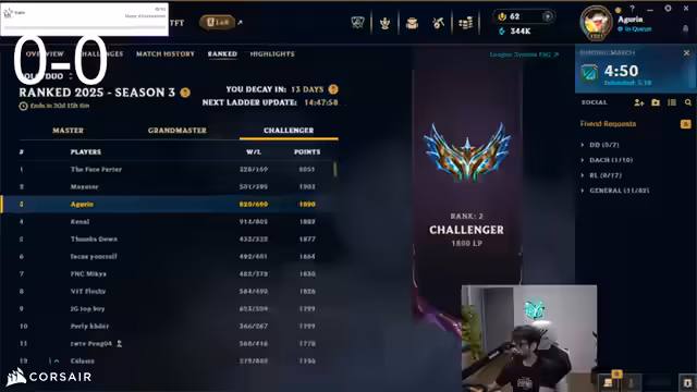 05:13:22Agurin feiert euphorisch seinen Aufstieg auf Rang 2 auf EU-West, was seinen neuen persönlichen Rekord in der aktuellen Season darstellt. Er drückt seine Genugtuung über das Erreichen von 1920 LP aus und kommentiert die intensive emotionale Belastung des Ranked-Climbs, während er auf die technischen Probleme während des Spiels reagiert.