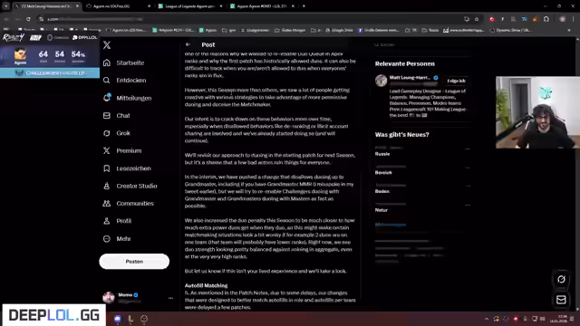 00:30:33Agurin leitet eine Ankündigung von Riot ein, dass eine Änderung bezüglich der Duo-Queue-Restriktionen in Apex-Rängen (Master, Grandmaster, Challenger) gepusht wird. Die neue Regelung erlaubt Masters, mit Diamond 1 zu duoen, Grandmasters mit Masters und Challengers nur mit Grandmasters. Diese Änderung soll in Patch 16.2 eingeführt werden und ist eine Reaktion auf frühere Test-Änderungen. Es folgt eine Diskussion darüber, ob Inspiration Secondary oder Full Scale Ingovering Storm besser ist.